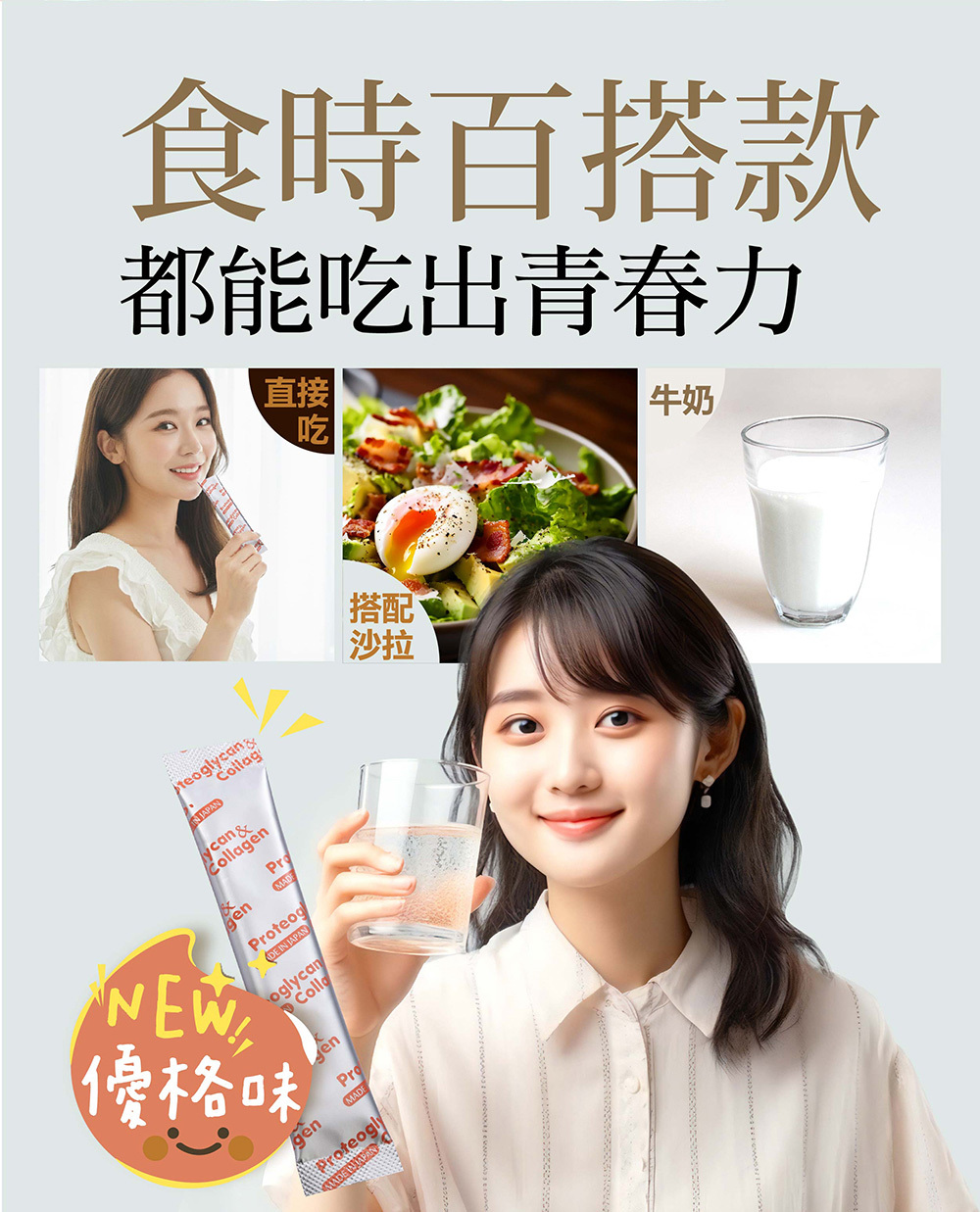 清爽優格微酸甜風味,搭配魚膠原蛋白胜肽的輕盈特性,讓每天的補充更容易接受,也更容易持續。