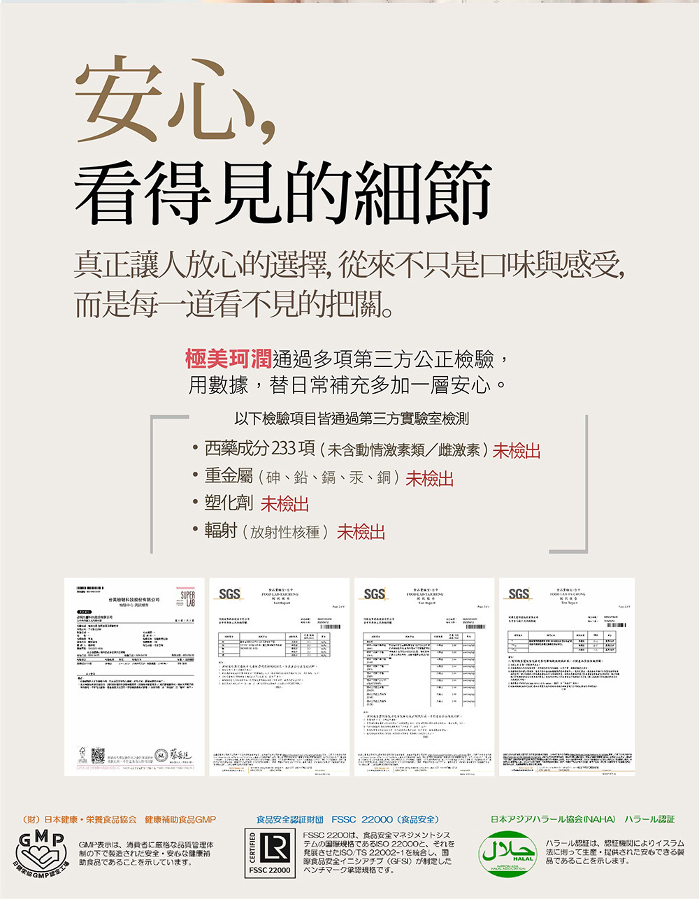 同樣重要的,還有安心。極美珂潤通過多項第三方公正檢驗, 確認未檢出雌激素類成分,讓補充回到單純,適合長期、天天入口。